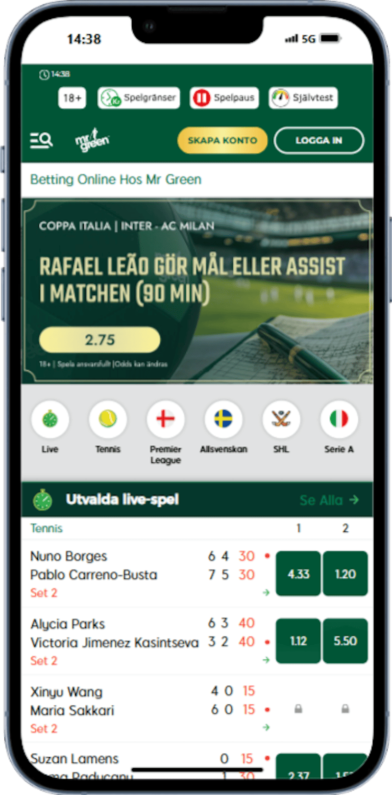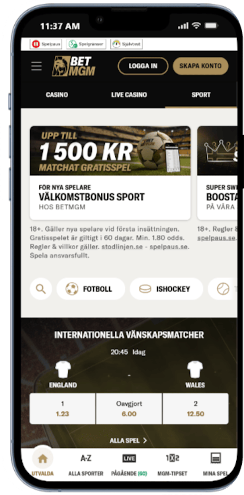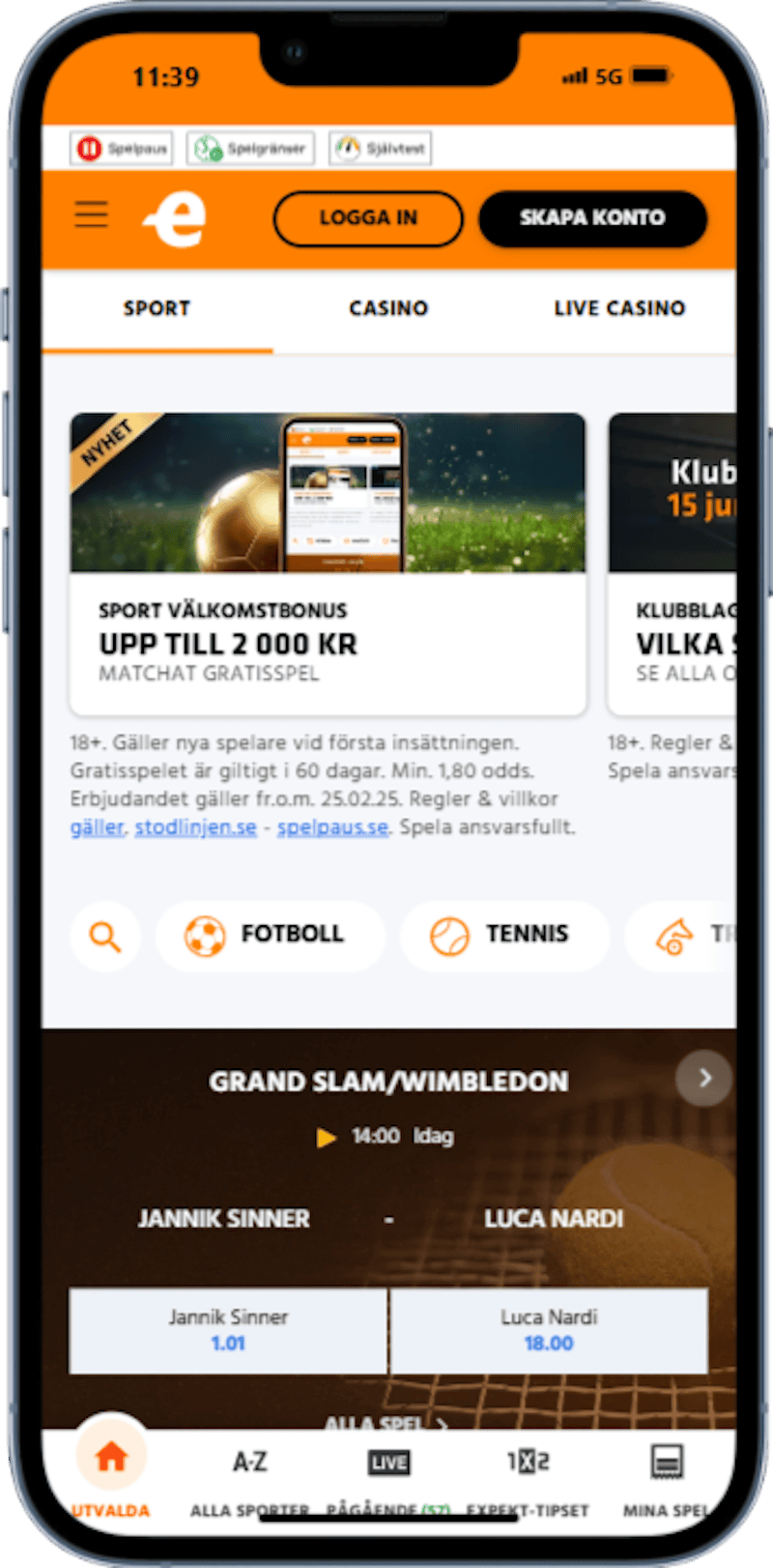 Åldersgräns 18 år | Endast nya spelare | Min. insättning 100 kr. | Sport: Gratisspel på 500 kr vid första insättningen. Gratisspelet måste spelas inom 60 dagar. Vinster krediteras minus värdet på Gratisspelet | Spela ansvarsfullt | Stodlinjen.se (020-819100) | Spelpaus.se | Klicka här för Regler och villkor | |||||